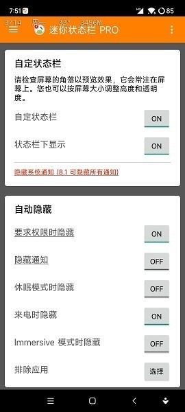 迷你状态栏Pro手机版真的是一个神器!它能让你的手机状态栏变得独一无二。操作超级简单,体积小巧不占内存,还能自定义颜色、字体、位置和布局。你可以随意调整文字大小和透明度,甚至可以设置圆角或者完全扁平风格,完美适配各种需求。