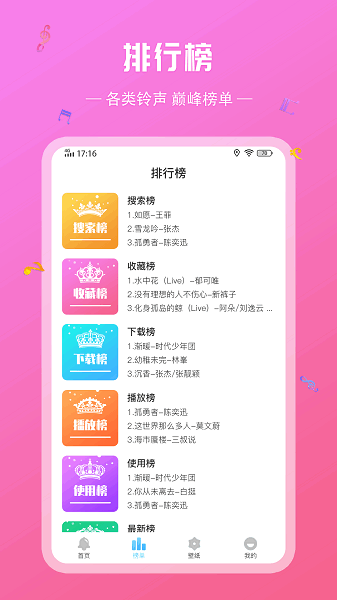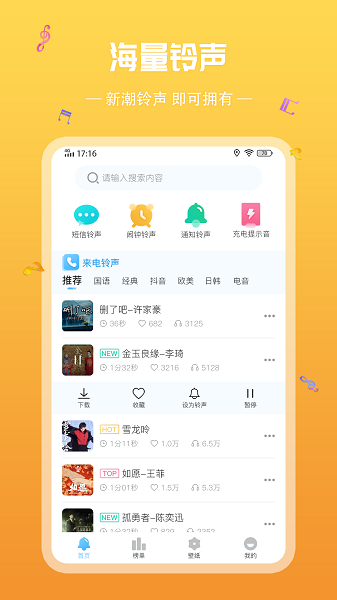 网络流行音乐、轻音乐、经典国语、原创金曲、欧美日韩、影视热曲、抖音神曲、DJ舞曲、恶搞、摇滚等火热铃声,汇聚各大明星来电歌曲,只要你想得到,在这里就能找得到。