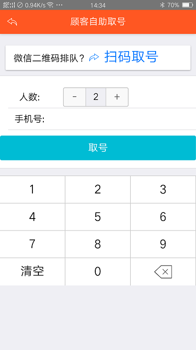 顾客自主取号:在线输入人数与手机号领取号牌;
