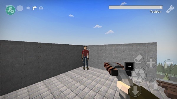 操作很简单,左边移动右边射击,点击左上角进行切换武器,使用手中的这把武器对着物体点击,会出现蓝色的引线,将它们链接起来,就可以通过滑动屏幕来移动这些物品的位置了。