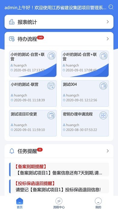 登录系统,首页可以搜索项目信息,会展示报表统计、待办流程、任务提醒、重要通知、已办以及工作实效。通过流程中心可以发起部分流程。待办流程可以处理业务信息。