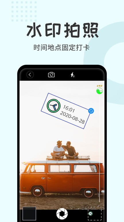一键获取当前时间作为水印,一键获取地址水印帮助用户拍照打卡。