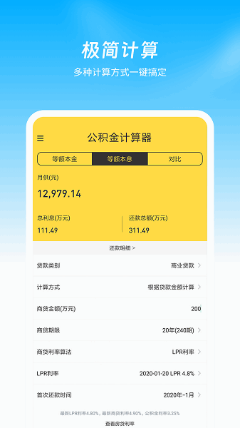 - 公积金房贷计算:支持公积金贷款利率的精准计算,满足您的个性化需求。