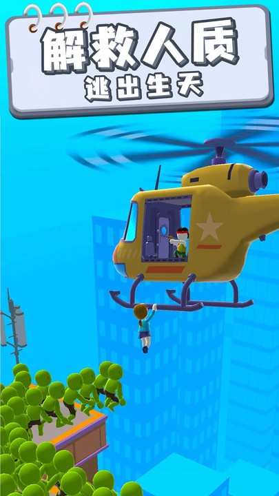 在前往救援的战斗中,你将乘坐直升机,通过武器掩护救援人质进行逃跑,直至人质搭乘上直升机,解救成功。