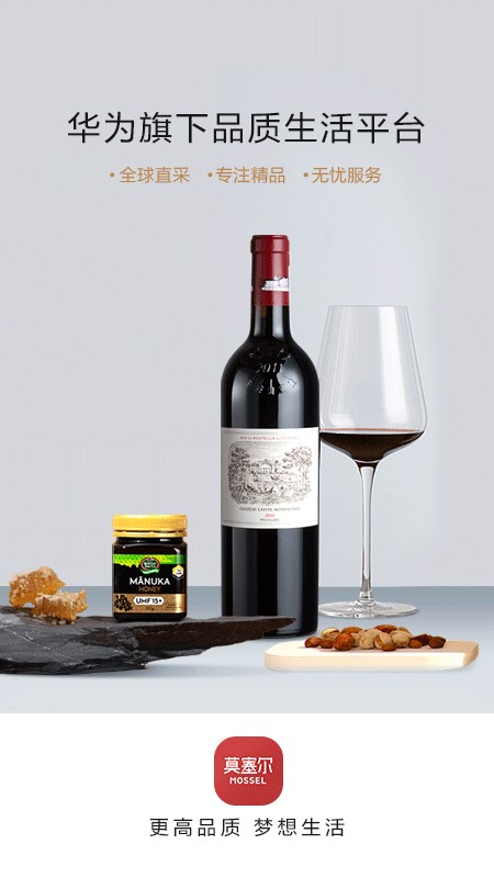 莫塞尔商城是华为旗下的品质生活平台,提供全球甄选的数百款优质产品,产品品类包括:葡萄酒、烈酒、牛肉、大米、橄榄油、海产品、坚果、茶叶、蜂蜜等。