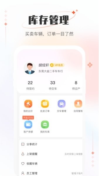 小美二手车车商版最新版是面向商户提供的二手车辆求购管理平台,轻松买卖车辆,订单详情信息实时记录,一目了然,轻松管理库存,每日上新,不同车型选择,批发车源,车辆档案配置尽在掌握,支持上架提醒,员工管理、我的车库,合同管理,交车等功能服务!