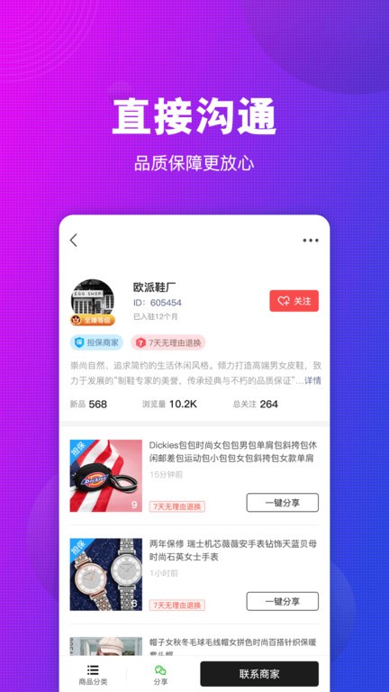 入驻商家自行发布商品,找货批发直接面向厂家,公开多种联系方式,无障碍直接沟通,点对点与商家联系,无任何服务费用,拒绝中间差价。
