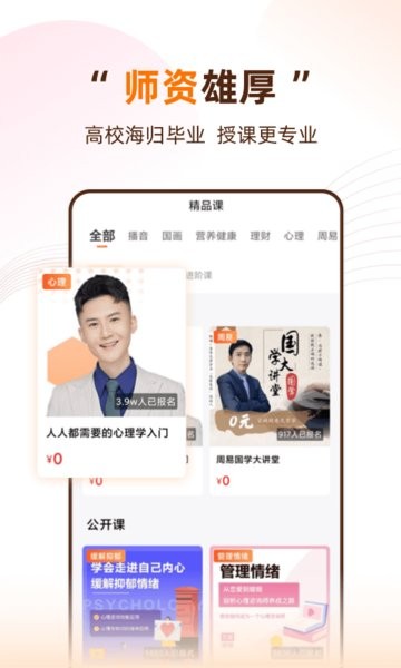 天天伴你学APP是一款成人兴趣类在线学习平台,课程涵盖国画、书法、营养健康、理财、播音主持、声乐、原画等,名师在线直播授课,帮助学员高效学习课程。