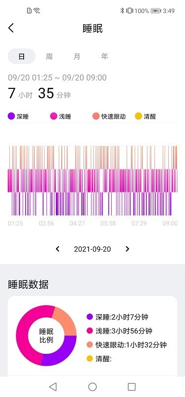 2、记录每天的睡眠情况,告知您每天的深睡时间、浅睡时间和清醒次数。