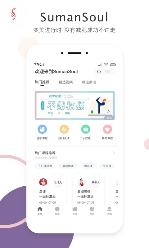 SumanSoul变身魔法课堂,开设有入门尝鲜、常规练习、专业升级等版块,每个版块的课程均由教研团队精心研发与测试,300名教练倾心打造安全有效的瑜伽练习环境,为你提供更加符合亚洲女性的减脂训练课程。