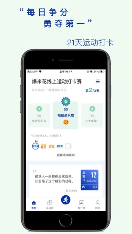 一键发起线上赛事,21天打卡激活精力;积分排名,奖品激励,从运动小白和同事一起成长为运动大神!