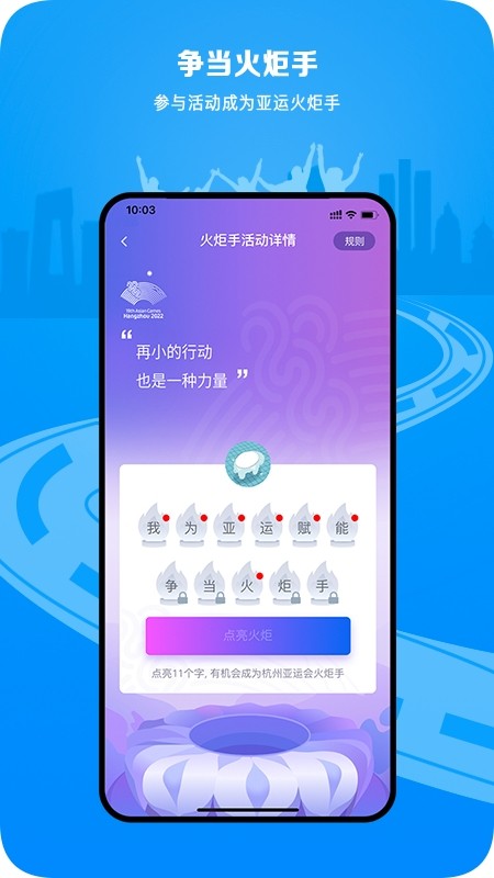 2、我为亚运赋能,争当火炬手主题活动上线,首期点亮“我”字活动--为杭州亚运加油同步上线