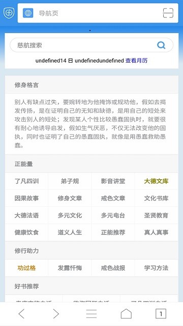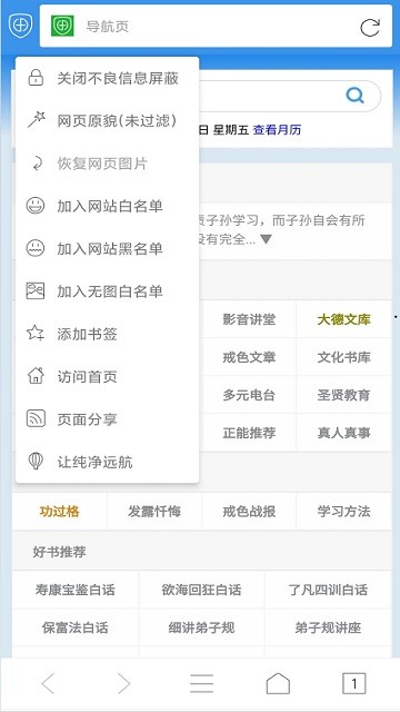 反黄之盾手机版最新版的app为慈航浏览器,此软件主要为戒色打造,是非常纯净的手机浏览器,用户可以在这里查看国学、健康饮食等知识内容,能够查看详细的戒色文章,能够屏蔽网页中出现的一些不良信息,还有超多实用的书籍资源可以查看哦!