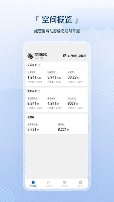 展示门店信息,包括门店客流、货架客流以及设备组数量,门店动态情况随时掌握