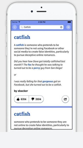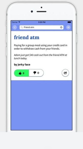 官方城市词典应用程序!Urban Dictionary是具有每个人编写的定义的在线词典。这里汇集了丰富的俚语资源,用户可以轻松的查找俚语的详细释义和例句,还可以通过社交网站进行分享。非常的有趣和便捷。