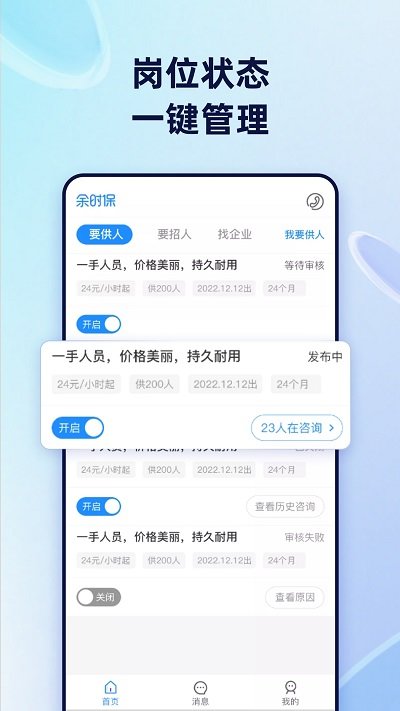 余时保中介版app是全新打造制作的招聘管理软件,面向中介朋友使用。这里汇聚了大量企业中介资源,实名认证,人员招聘数据真实,海量岗位状态一手掌握,可以随时在线直聊,轻松招聘,快速上岗,使用简单易上手,提高上岗工作的效率!
