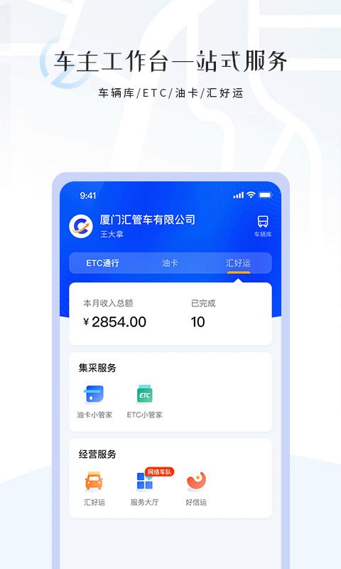 汇管车app最新版是货主和车主办公的好帮手,可以轻松的在这里找货主和找车源,能够查看详细的服务订单信息,支持进行油卡和etc的充值,下单更方便,可以查看详细的订单数据,包括各种订单的数量和状态!