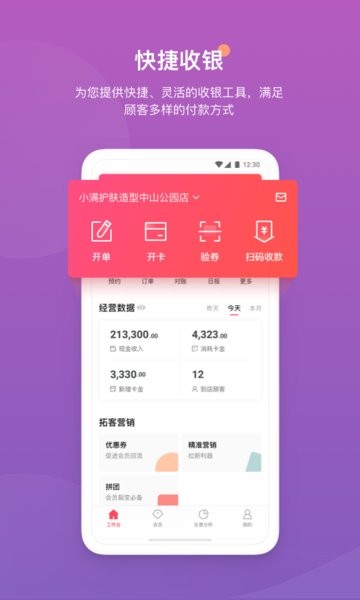 提供多样的营销工具,发券、拼团、短信营销、微信公众号,帮老板拉更多的新客、让会员更愿意到店服务。