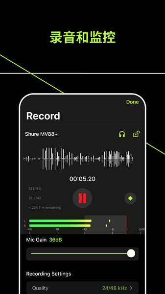 shureplus motiv 应用可与motiv数字话筒和录音解决方案配合使用,实现实时功能调节和文件共享。易于上手的界面,包括24位/48 khz未压缩录音、可选dsp预设模式、话筒增益调节,以及直观的立体声宽度控制,可根据声源和周边环境来调节话筒拾音模式,实现出色音效。