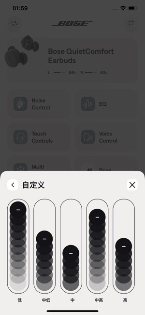 在 Bose QCE 应用程序中进一步个性化。五频段可调均衡器设置让您可以随时调节声音并控制低音、中音和高音水平。在 ANC 设置之间切换,从静音到感知再到关闭。使用该应用程序检查电池寿命、自定义快捷方式和管理连接的设备。