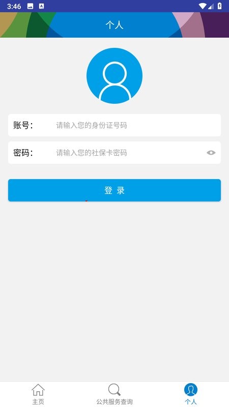 -- 登录APP,登录时输入个人18位身份证、社保卡密码(初始密码“000000”无效),登录后跳转到主页(点击确认或者点击左下角的主页按钮)