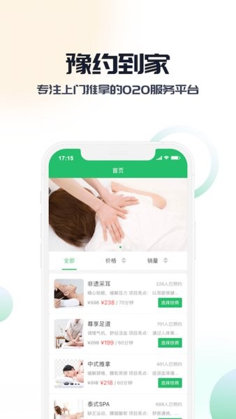 豫约到家软件最新版为客户朋友提供了专业便捷的上门推拿按摩服务,可以在手机上查看附近的门店,能够在手机上查看技师的详细信息以及套餐的看价格,支持直线预约,专业的技师会按照预约时间上门进行推拿。