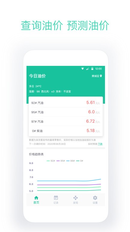 今日油价app最新版软件可以查询每日的油价,各种型号的油均可查询,能看到详细的油价趋势变化曲线图,可以记录每天的油耗,能查看每月的油耗支出柱状图,可以定位和查找附近的加油站,能看到每个加油站的优惠情况。