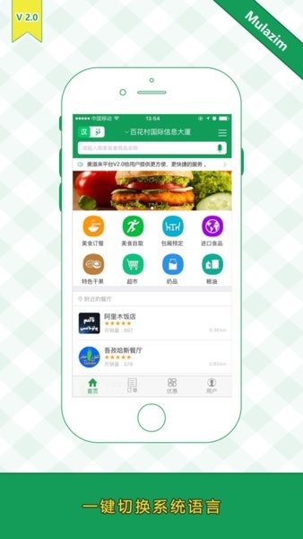 mulazim美滋来外卖app汇集了各种各样的美食,用户能够在手机上选择自己感兴趣的外卖进行订餐和支付,支持维语和汉语两种语言,能够自由切换,自动定位当前位置,显示优质的商家用户,除了美食还能选购商超用品哦!