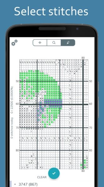 1.标记完成的针迹。通过水平,垂直甚至对角线滑动轻松选择。也可以标记整个10 x 10正方形。如果您导入的图表中已包含注释,我们将尝试将其作为当前进度导入。成品针脚以彩色显示,可轻松浏览并与针脚进行比较。