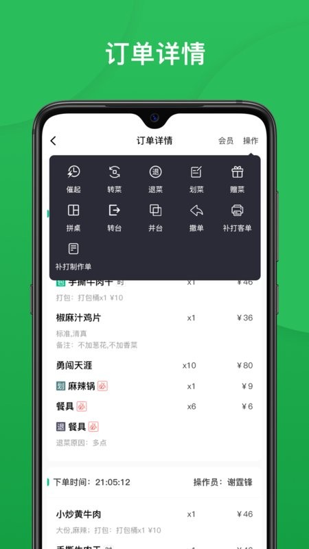 【下单收银】:选择菜品,自动计算消费金额,开单、收银、结算快速搞定。
