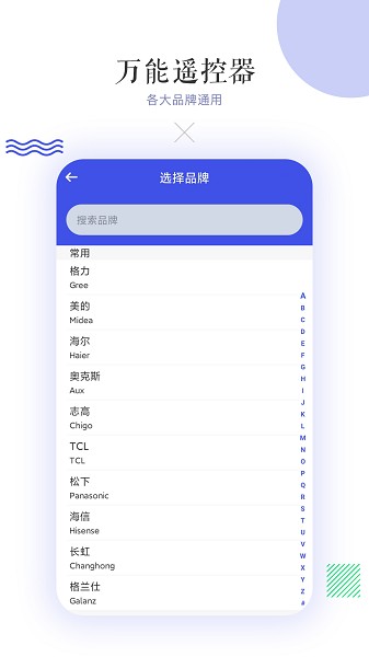 空调万用遥控器支持各种品牌空调,无需红外功能也可使用,内置遥控器码库,无需网络轻松遥控,人性化智能搜索遥控器,支持快速添加、编辑、删除、切换、排序,输入电器品牌/型号等关键词即可搜索,再不用对着数十套遥控器数据逐一匹配,没有红外功能的手机也可使用,WIFI遥控无需对准,接上外置红外发射器配件让手机遥控更轻松!