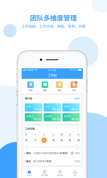 指标完成度、员工工作简报、转化率分析、客源分析、业绩排行榜等