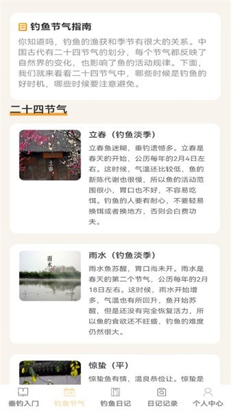钓鱼指南软件是一款面向钓友们提供的钓鱼指南服务app,这里有着丰富的钓鱼信息,涵盖各种钓鱼节气指南介绍,二十四节气轻松了解,还有钓鱼入门指导,轻松掌握更多钓鱼技巧知识,更可以自由选择天气标签,记录天气和钓鱼日记,方便简单!