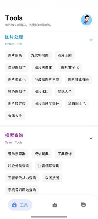 软件首页分为七大类,日常生活、系统操作、图片处理、搜索查询、解析提取、文字工具、其他工具,每一个大的分类下有很多小的工具。