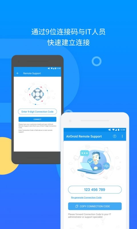 airdroid remote support手机版是一款远程控制工具,通过连接码进行连接,可以将屏幕即时分享it成员,同步操作轨迹,跟随步骤轻松解决问题,还可以实现实时语音对话,降低沟通成本,操作简单快捷,方便好用,值得推荐!