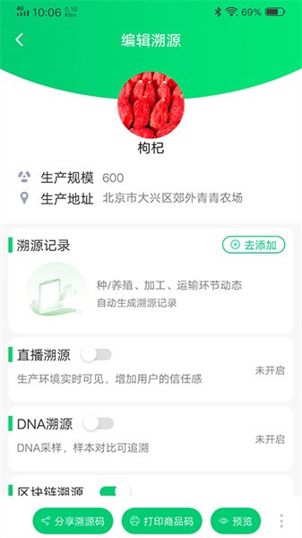 易溯源是一款快速生成农产品一物一码的农业溯源APP,从种/养殖到加工到包装再到运输,全程数据生成溯源码,视频直播好品质实时看得见,溯源码快速分享扫描,店铺链接跳转推广传播和复购,帮您实现卖得多卖上价,提升品牌~