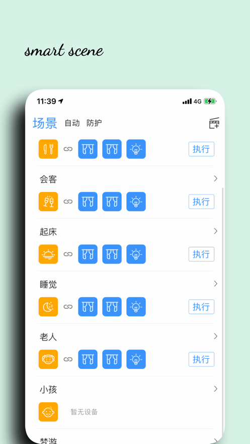 添加智能场景方案,如会客、离家、回家、就餐、休息等多种智能场景。