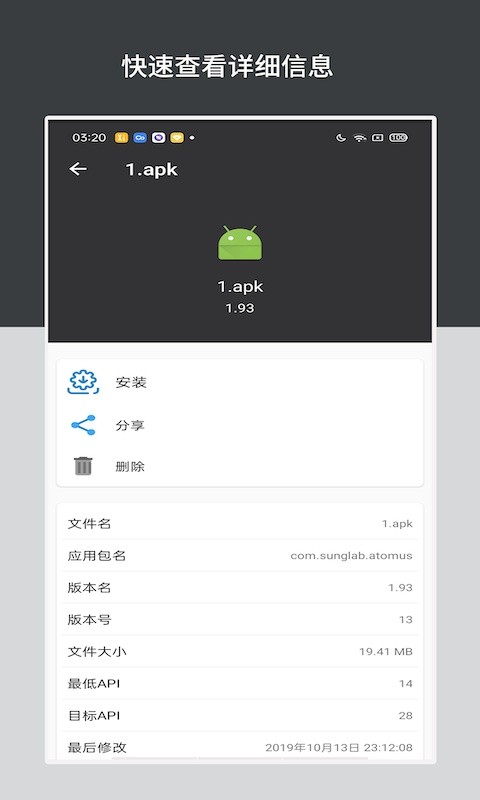 2、支持安装包大小、签名以及包名和更新时间等查看;