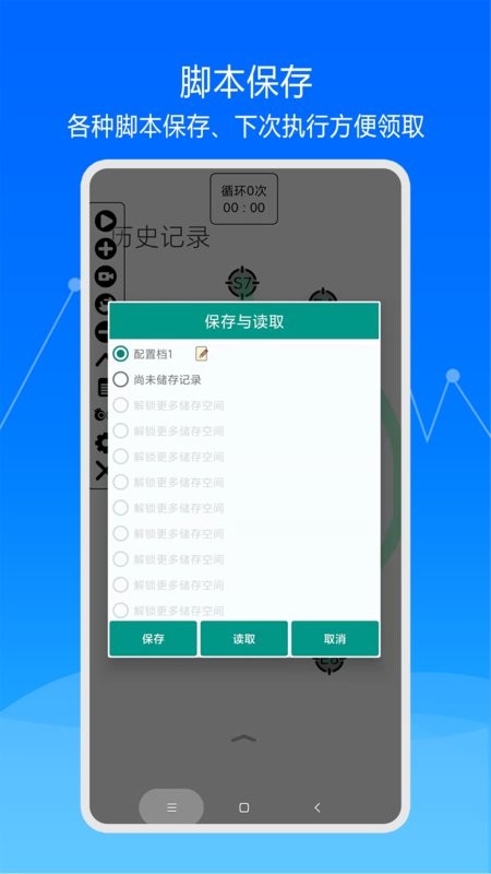 通过浮动控制面板以启动/结束自动点击。您可以使用控制面板在屏幕上添加点击位置实现自动点击。点击位置保存功能,下次回来继续使用!