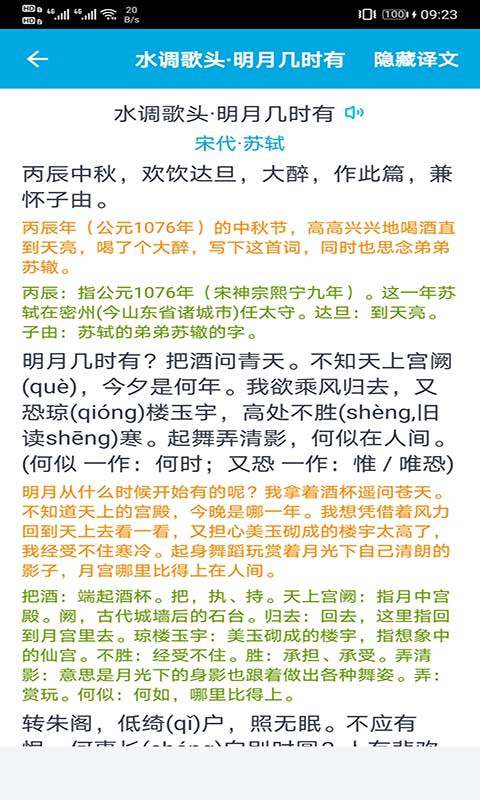 手指点击一下就能看到或隐藏每段古文对应的白话文,非常方便学习理解。