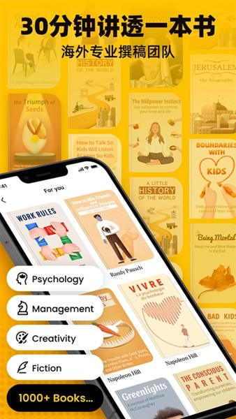 -- 不限场地,音频内容想听就听 思维导图,一览每本书的精华要点 本地储存,无需Wi-Fi即可学习 12个类别,提供非虚构类全领域学习范围 好书速递,比尔-- 盖茨、《纽约时报》等推荐的书籍 轻松学习,30分钟便让你掌握一本书的核心 毫无压力,通知系统绝不对你狂轰滥炸