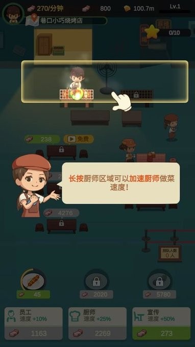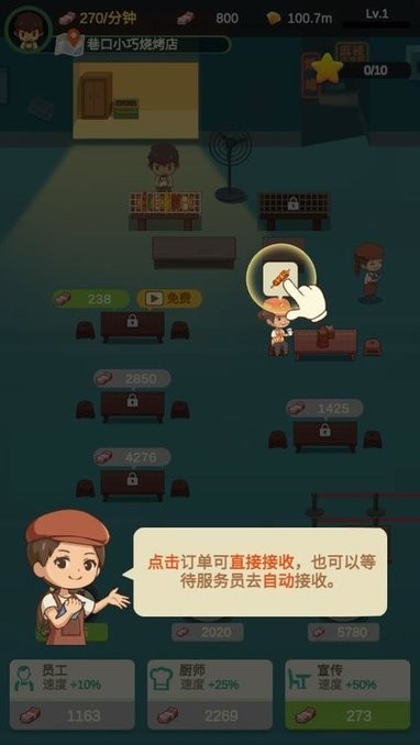 通过点击升级来获得更多色味俱佳的烤品,升级服务员和厨师的等级,满足食客们的口腹之欲