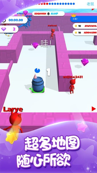 开始一场2vs18的超大追赶游戏,随机到老鼠利用各种障碍与道具躲避猫的追赶,并收集更多的宝石。随机到猫尽量用你的灵动走位和预判抓住狡猾的老鼠们。