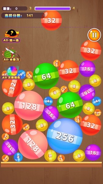 3、游戏中的关卡中会发射一个个球,玩家需要看清楚球上面的数字,吧球射到和下面数字一样的球旁边,它们就会合成一个更大的球哦。