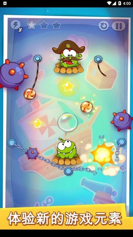 1、在其中需要根据不同的情况切断糖果的绳子,打破气泡或按下吹气装置;