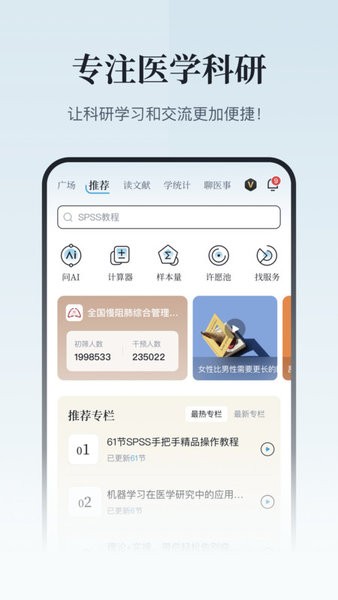 医咖会提供包括SPSS、R语言、Stata在内的统计分析教程,以及临床研究设计、样本量计算、Meta分析等高质量内容。