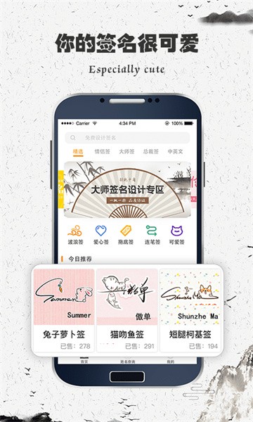 这款独一签名大师app真的超级棒!它能让你设计各种艺术签名,风格多样到爆炸。无论是高端大气的商务签、霸气总裁签,还是萌化人心的卡通签(比如鱼骨签、兔兔签),都能满足你的需求。最让我喜欢的是它的大师设计功能,轻轻一点就能让专业设计师为你手写签名,细节处理得很到位,感觉特别高级。