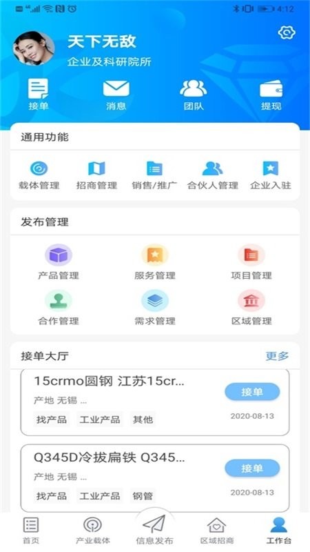 用户可以根据类型自行选择自己的需求发布,信息审核通过后会展示在工作台接单大厅,所有用户可以选择自行接单对接