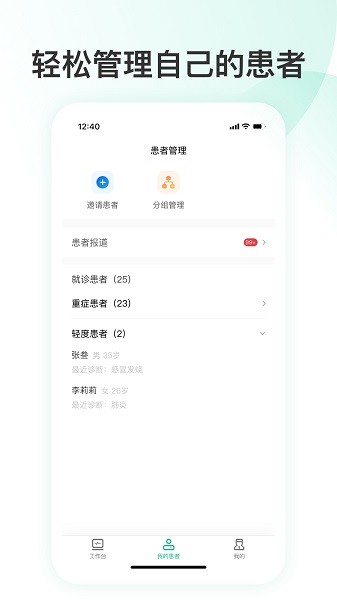 【患者管理】医生可以针对不同疾病、不同类型的患者进行分组管理,进行诊后随访可以及时获取患者的疾病情况,群发消息可以快速通知到对应的患者。