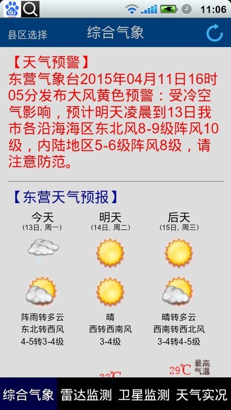 是东营市气象局为东营人打造的手机气象客户端,可以提供东营地区的天气预报、预警、实况、雷达监测、卫星云图及空气质量、海温潮汐等服务信息。